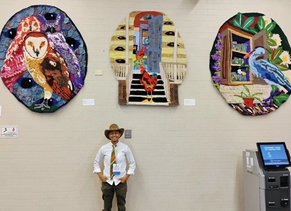 When the Rooster Comes, Death Follows, 50" x 61", tufted yarn, repurposed canvas, 2024