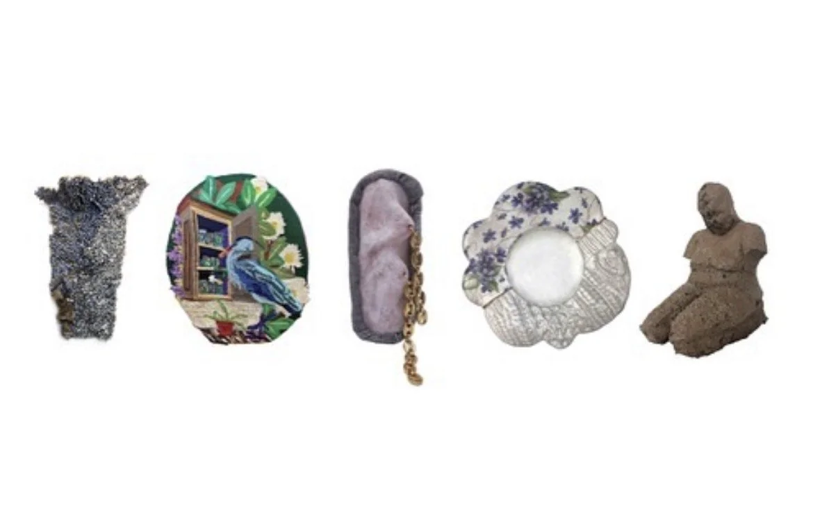 Martins Visitation, 5" x 12" x 6", repurposed materials and birds, embroidered canvas, 2025 (Lovingly: Black, Queer, Interracial Tennessee in Craft, Knoxville, TN)
