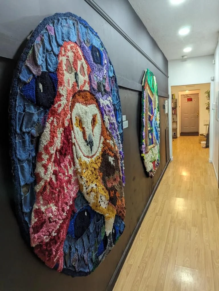 Deathly Owls & Pocket remedies, 67" x 53", tufted yarn, repurposed indigo dyed canvas, resin embellishments, 2023